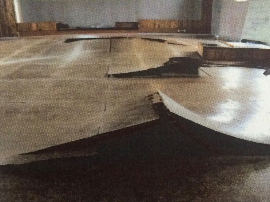 The church had fallen backwards, five feet to the ground. The back walls had bucked and cracked. Insulation, reddish and wispy, spewed out. Some pilings had collapsed, and the ones still standing had torn gaping crevices through the floor.