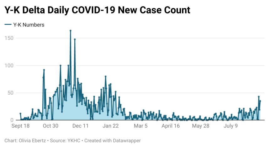 After a few months with low case counts, COVID-19 appears to be once again surging in the Y-K Delta. Daily cases across the region have been hitting the double digits consistently since mid-July. On Aug 17, the region hit its highest case count since January, with 43 cases reported in a single day. Hospitalizations are increasing too. The Y-K Delta surge is consistent with a sharp spike in cases statewide and across the nation.