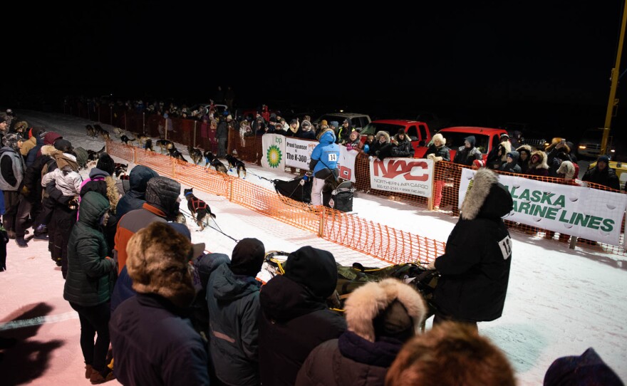 Jason Uyaqaq Pavila leaves the starting line of the Bogus Creek 150 in Bethel, Alaska on January 18, 2019.