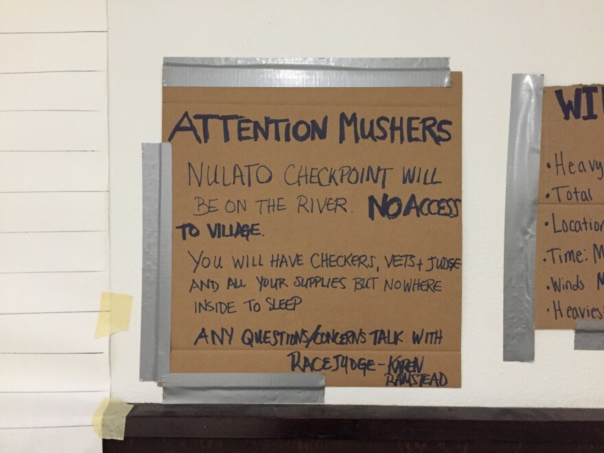 In Nulato this morning, cardboard signs told mushers to check in outside of the village, that there was no access to the village itself. The sign explained that there would be checkers, judges, vets, and supplies, but mushers would have to camp outdoors because there would be no place for them to bunk. Another cardboard sign told them that there would be no formal check-in at Shaktoolik, that it would be a resupply spot only. Mushers would find their supplies, and straw for their dogs, 2 miles outside of the old village.